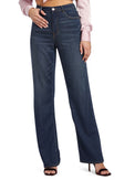 Jeans à jambes droites. Taille haute avec bouton et ganses. Surpiqûres de couleur jaune moutarde. Bouton et rivets en métal argent avec contour de teinte cuivrée. Denim doux et extensible délavé au niveau des cuisses.