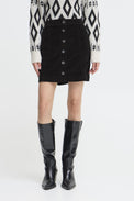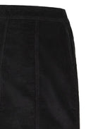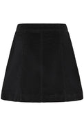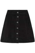 Jupe courte et évasée. Taille régulière. Boutons marbrés. Poche sur les côtés. Coutures apparentes devant et derrière. Velours côtelé extensible.