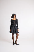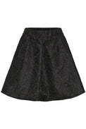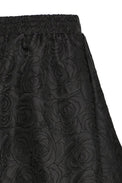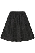 Jupe courte et évasée à effet bouffant. Taille régulière à bande élastique derrière. Tissu légèrement lustré non-extensible. Broderie florale.