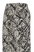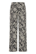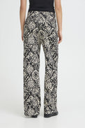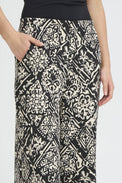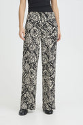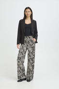 Pantalon à jambes larges de type «pull-on». Fermeture éclair invisible sur le côté. Poche sur les côtés. Fausses poches de ville derrière. Tissu extensible. Rayures 2 tons verticales ou motif abstrait d'inspiration florale. Aussi disponible en écru avec rayures de couleur marine.