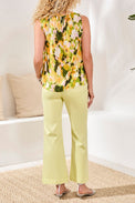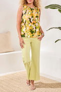 Top sans manches. Encolure ronde avec bouton et ouverture au dos. Bordure à fronce au col et à l'emmanchure. Coupe légèrement évasée avec fente sur les côtés au bas. Insertion de broderie anglaise pour donner un effet raglan devant et derrière. Tissu soyeux avec un petit motif ajouré dans le tissu. Motif floral abstrait.  Peut rétrécir au lavage.